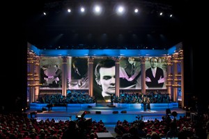 В Пятницу при полном аншлаге на сцене "Крокус Сити Холл" прошел грандиозный концерт в честь 70-летия со дня рождения легендарного певца Муслима Магомаева. Известные российские музыканты, которым посчастливилось работать и дружить с певцом - Лёв Лещенко, Лариса Долина, Тамара Гвердцители, Дмитрий Хворостовский, Ирина Аллегрова, Эмин и многие другие. В этот день на концерт приехали самые преданные поклонники певца всех возрастов, некоторые из которых прибыли из соседних регионов. На концерте Эмин исполнил композицию "Синяя вечность", которую "открыл" с экрана сам Муслим Магомаев.